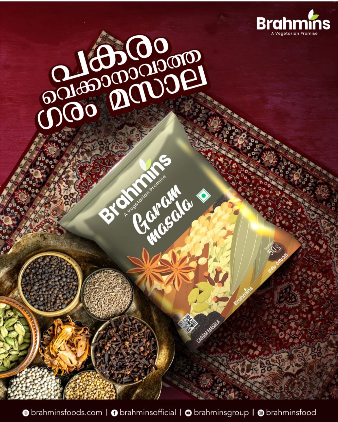 Brahmins Garam Masala is a traditional Indian spice blend, a fragrant mixture of aromatic spices like coriander, cumin, cardamom, cloves, cinnamon, and black pepper, used to add warmth, depth, and flavor to dishes such as curries, dals, and marinades. It is a vegetarian product, made from carefully selected and processed natural ingredients, and is free from artificial additives and colors.