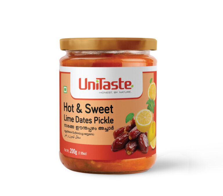Unitaste Hot and Sweet Lime Dates Pickle is a Kerala-style preserve that balances tangy limes with sweet dates, a symphony of traditional spices like ginger, chili, and fenugreek, and the distinct aroma of sesame oil, offering a versatile condiment to accompany Indian meals. The unique combination of sweet, sour, and spicy flavors makes it a culinary delight that enhances dishes like rice, roti, and snacks.